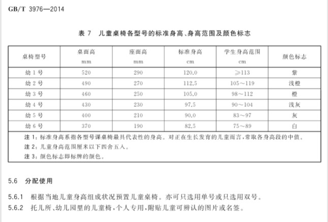 儿童桌椅各型号标准身高、身高范围及颜色标志